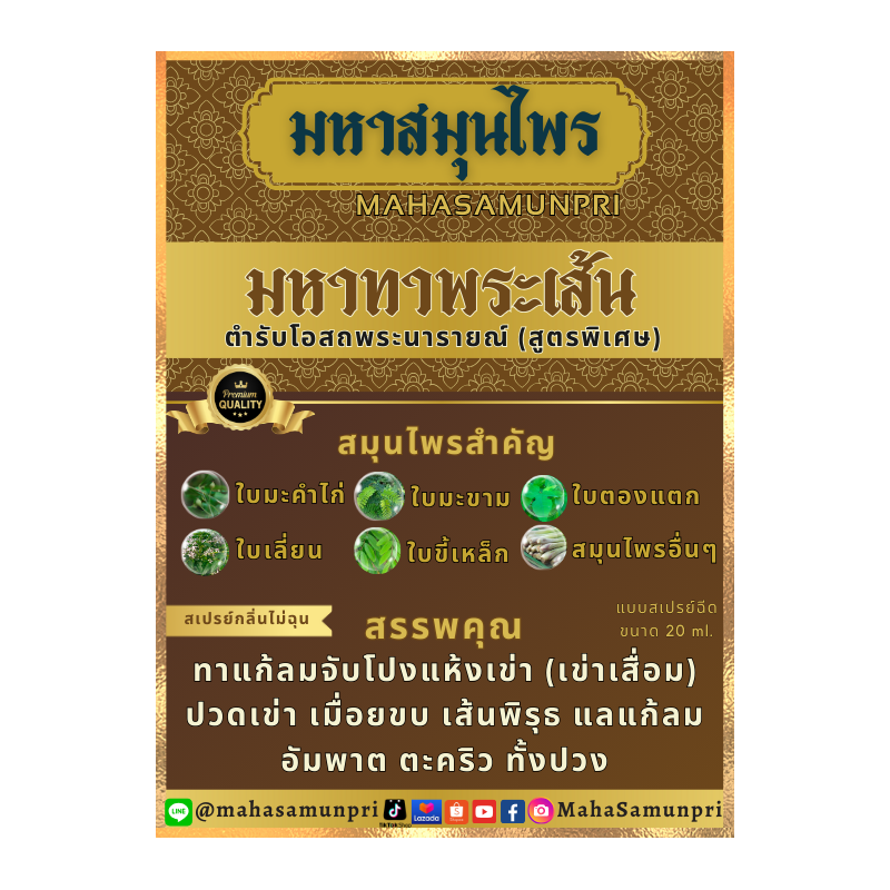 มหาทาพระเส้น (สูตรพิเศษ) มีความแตกต่างจากทั่วไป ปรับปรุงให้มีความร่วมสมัยและมีประสิทธิภาพดียิ่งขึ้น เห็นผลเร็วขึ้น สเปรย์ซึมเข้าผิวหนังไว เย็นสบายได้นาน ช่วยอาการปวดเข่า ปวดเมื่อย ออฟฟิตซินโดรม ตะคริว และมีกลิ่นหอมเย็นสดชื่น จากกลิ่นหอมดอกไม้นานาชนิด ที่มีสรรพคุณช่วยให้รู้สึกผ่อนคลายจากความเครียด และอ่อนล้า